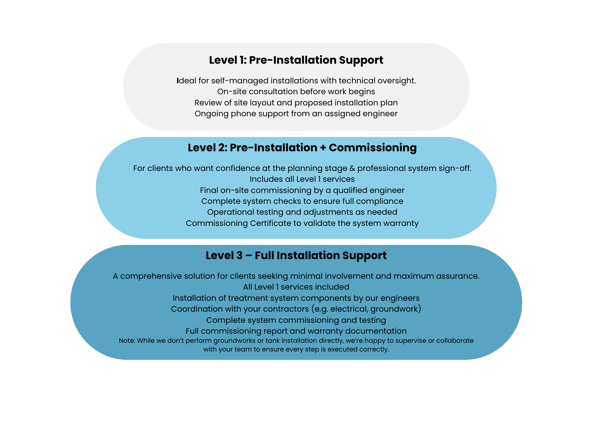 While many contractors are well-versed in groundwork and drainage, the technical setup and final commissioning of treatment systems can require specialist expertise. Our qualified engineers bring the knowledge and precision needed to protect your investment, ensure compliance, and maintain warranty coverage.